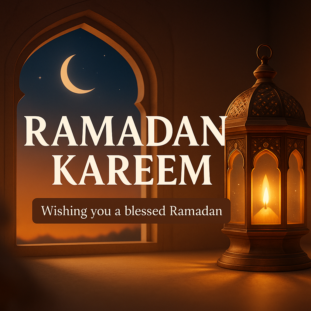 Ramadan Greetings Promotional Graphic with Lantern and Crescent Moon
