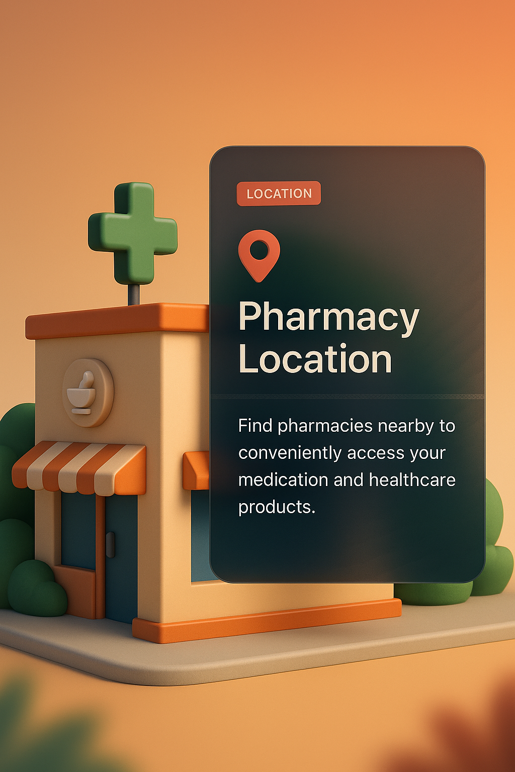 /Collection: /by davooda/Type: PNG/A vibrant 3D representation of a pharmacy building featuring an informative overlay. The design includes a gradient background and clear text for easy readability.