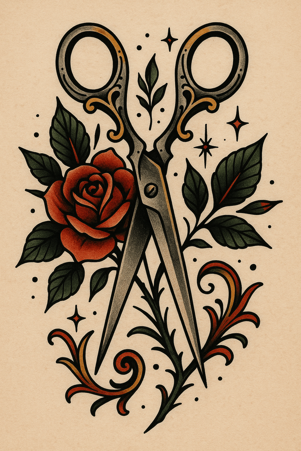 This is a digital illustration featuring vintage scissors surrounded by a rose and intricate floral elements. The design has a classic tattoo style, suitable for art prints or decor.
