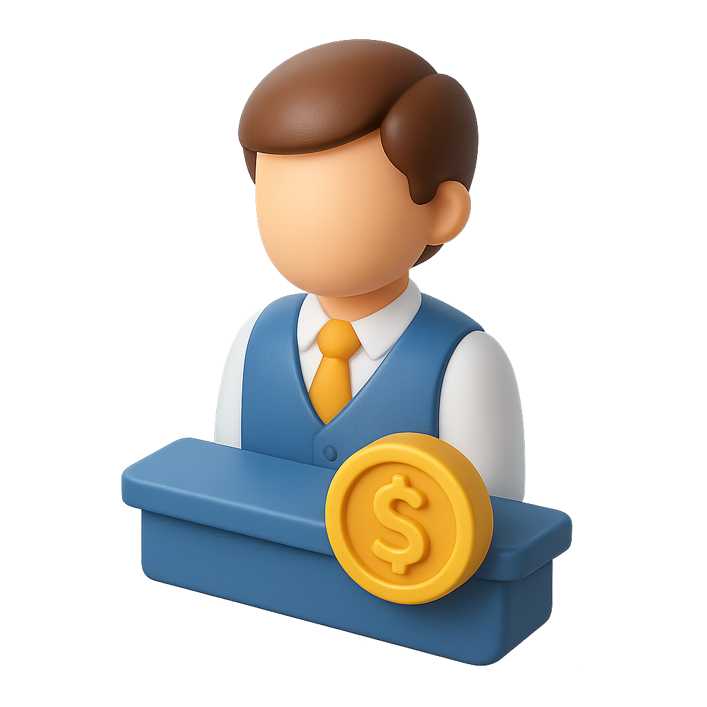 A 3D icon of a bank teller in isometric view featuring a figure in a blue vest and a yellow tie, set against a gradient background with a dollar coin.