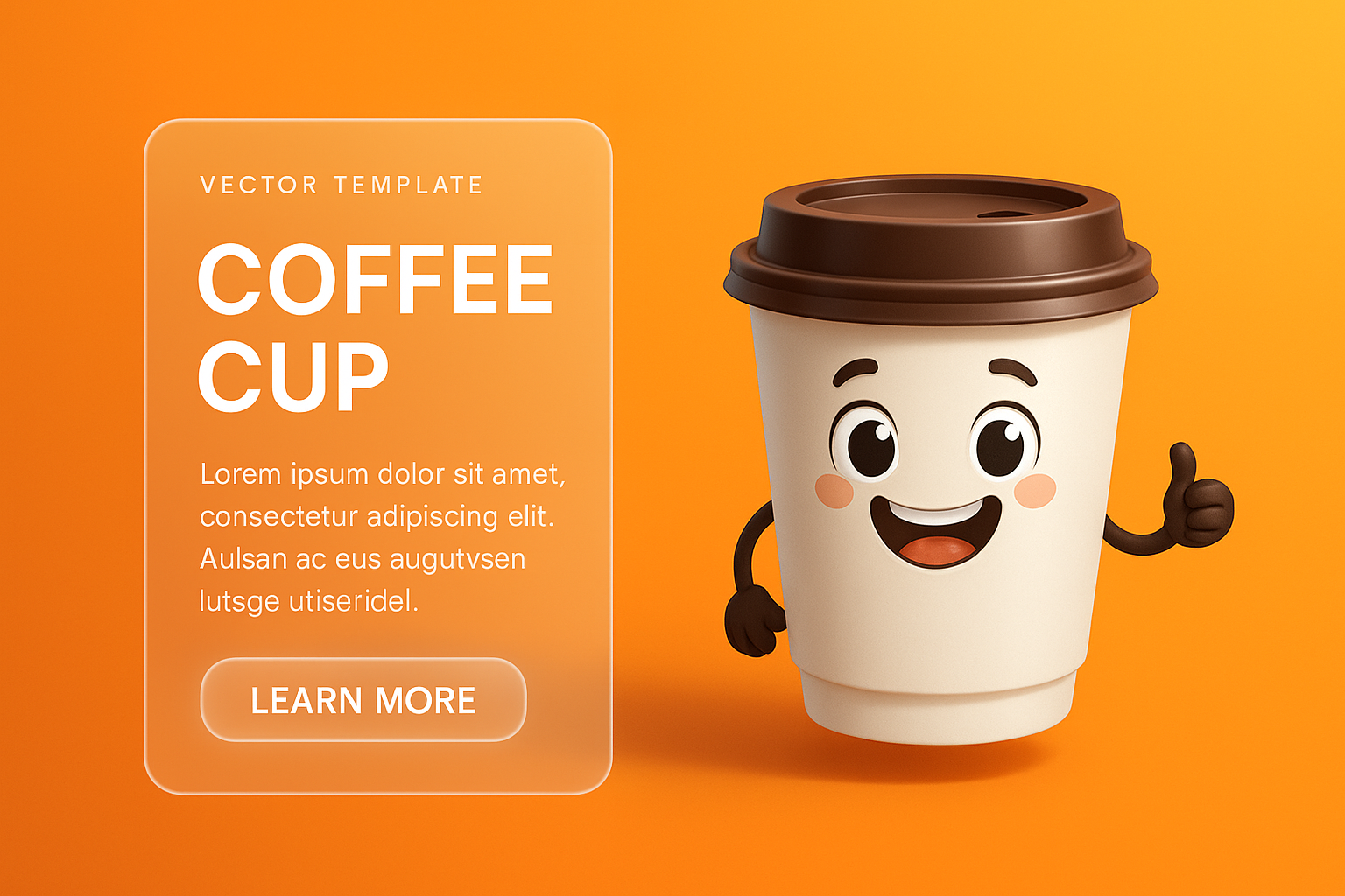 A vibrant logo featuring a smiling coffee cup mascot on a bright gradient background. Includes modern glass panels with a call-to-action button, blending realism and futuristic design.