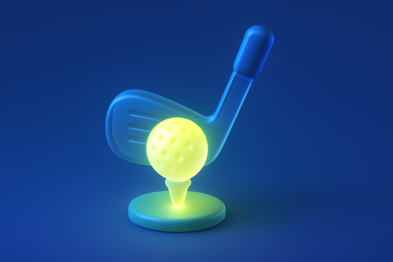 A visually striking 3D golf icon featuring a glowing golf ball and club against a solid blue background. The design emphasizes realism, with soft lighting creating an atmospheric effect.
