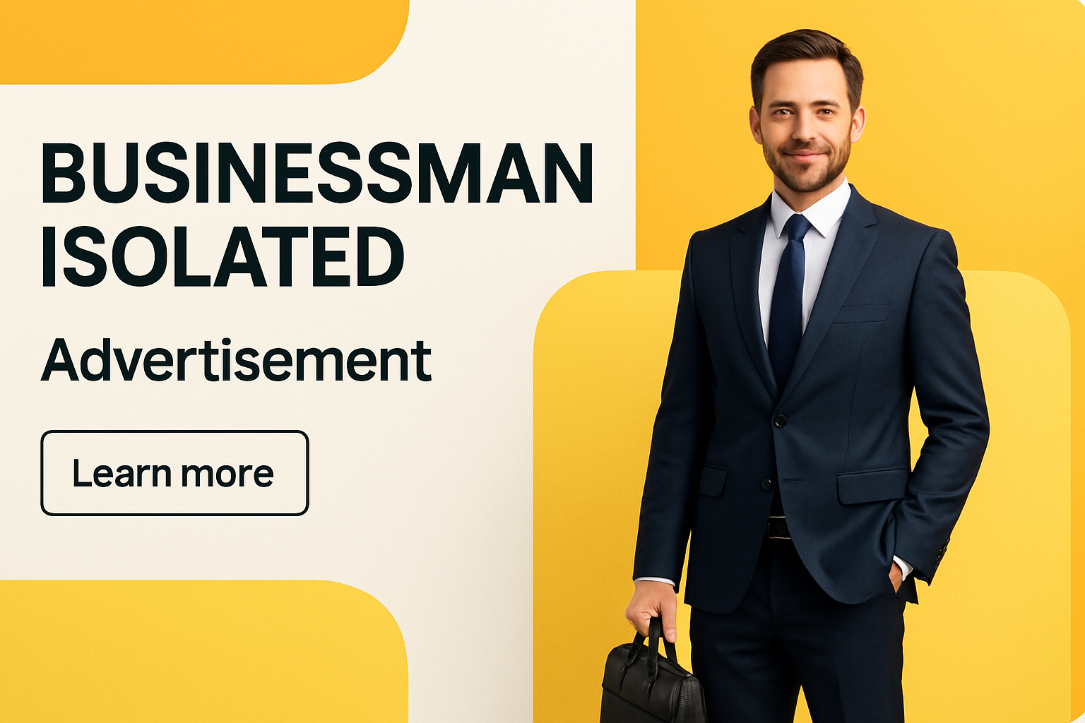 /Collection: /by davooda/Type: PNG/A modern corporate advertisement showcasing a businessman in a sharp suit against a bright, geometric background. The layout emphasizes clarity with bold typography and a call-to-action button.