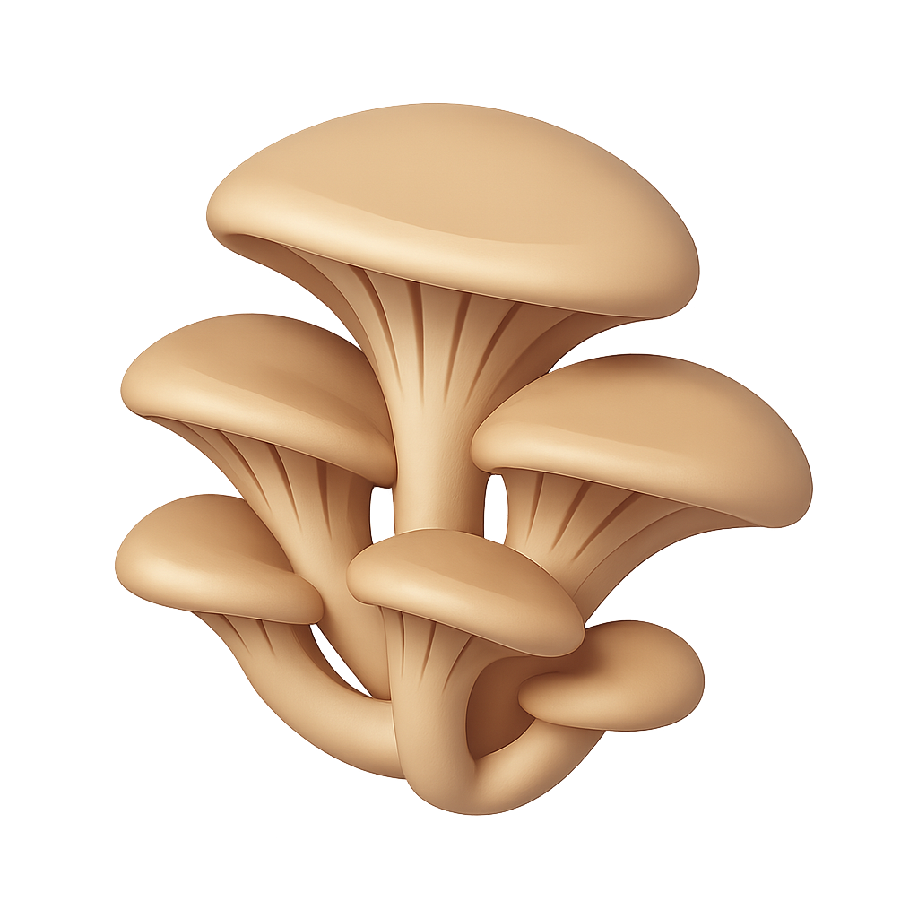 A stylized 3D representation of an oyster mushroom cluster, featuring smooth, rounded caps and a detailed stem structure. The icon is designed with a transparent background and an isometric perspective.