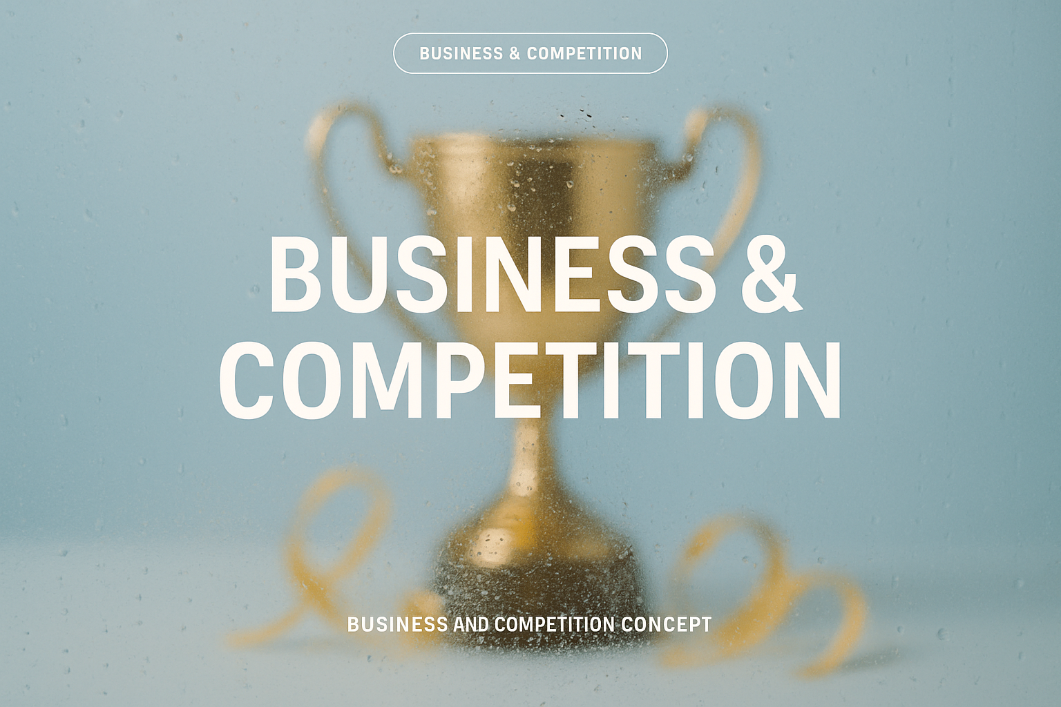 /Collection: /by davooda/Type: PNG/A golden trophy stands prominently against a soft blue background, enhanced by water droplets on a glass surface, creating a fresh and poetic mood. The text highlights business and competition themes.