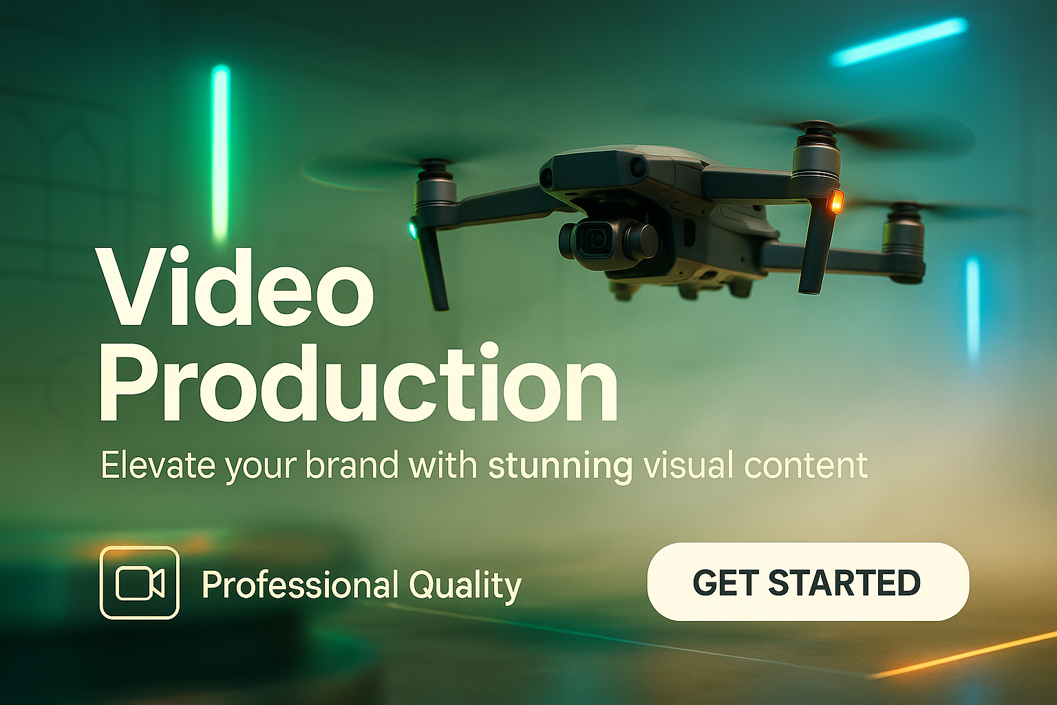 Dynamic promotional graphic showcasing a drone in action, designed to highlight video production services with a modern and engaging visual style. Ideal for digital marketing.