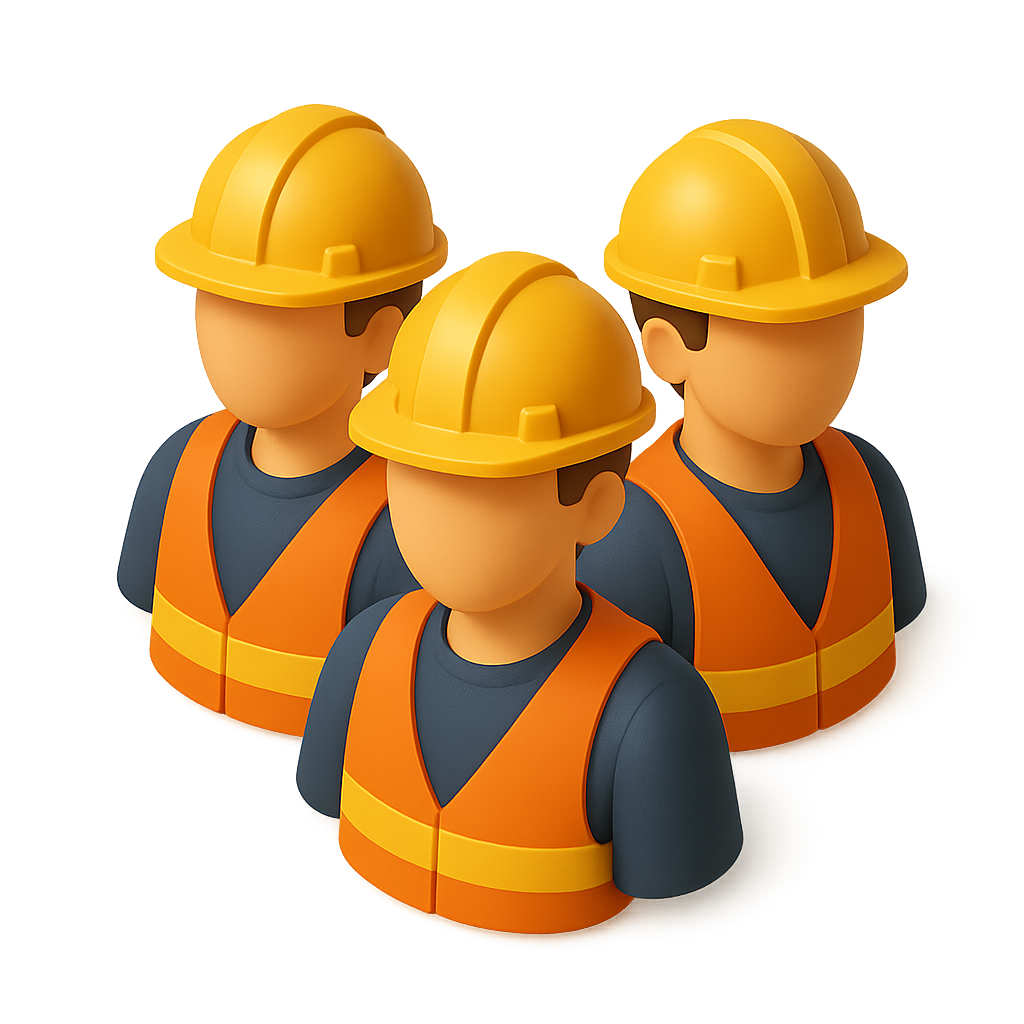 /Collection: /by davooda/Type: PNG/This image features three stylized 3D construction worker icons, each wearing a yellow hard hat and an orange safety vest. The isometric view gives a volumetric feel.