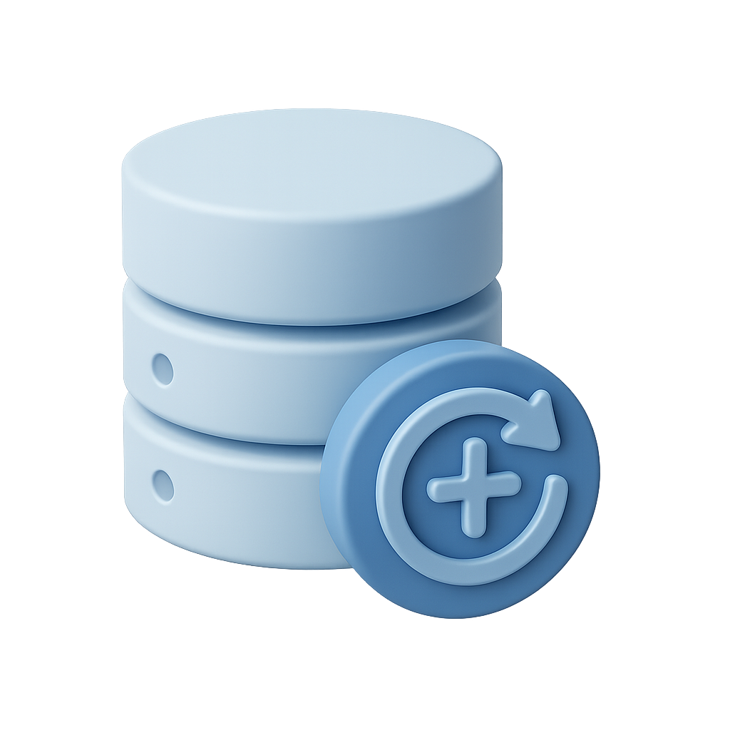 /Collection: /by davooda/Type: PNG/A three-dimensional representation of a database icon featuring stacked disks and a refresh symbol. The icon has a transparent background and a smooth, volumetric design.