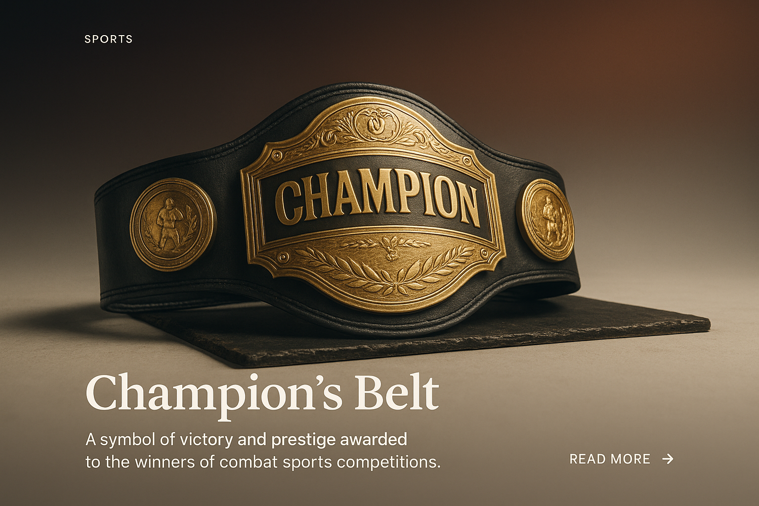 A realistic illustration of a champion's belt, symbolizing victory and prestige in combat sports. The design features a two-color gradient background with a sophisticated layout.