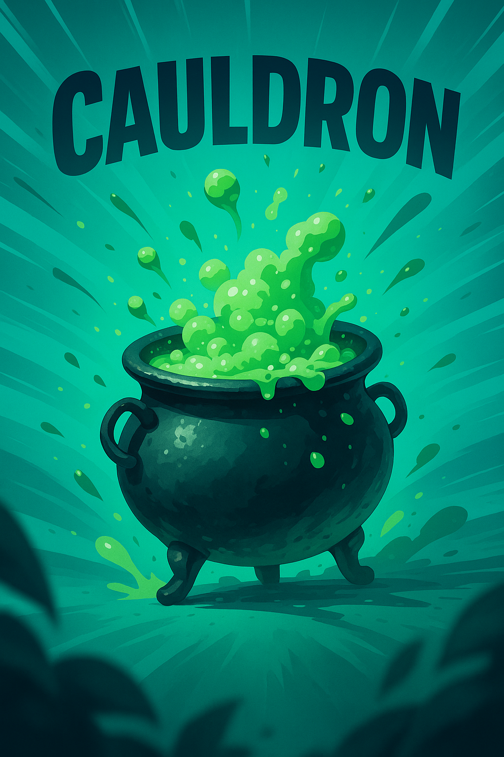 /Collection: /by davooda/Type: PNG/This image features a dynamic cauldron bubbling with vibrant green liquid, surrounded by energetic rays emanating from the center. The background transitions smoothly to a solid color, enhancing the cauldron's vividness.