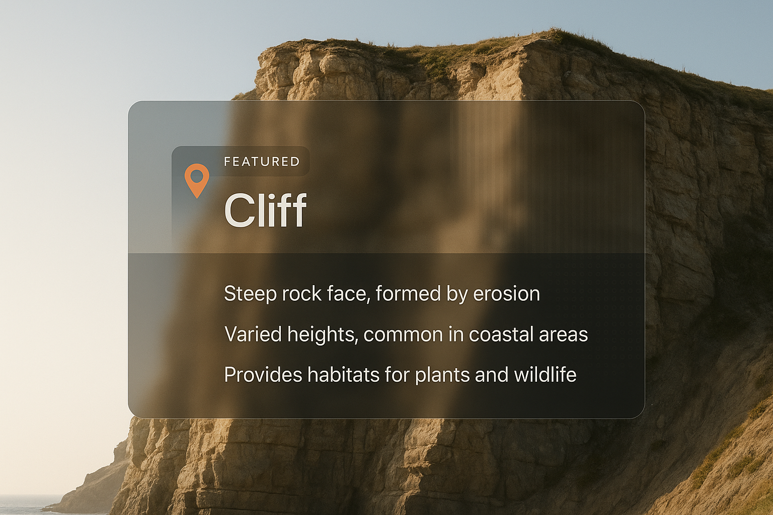 /Collection: /by davooda/Type: PNG/The image showcases a cliff with a sleek, modern overlay featuring informative blocks that highlight key details about cliffs, including their formation and ecological significance.