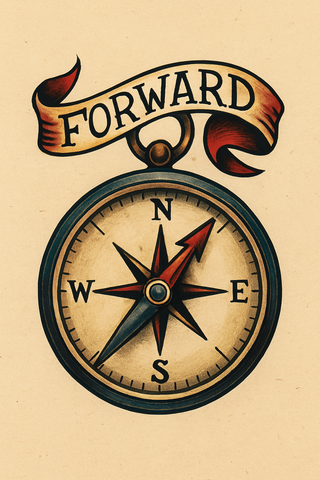 A classic tattoo design featuring a compass with a vibrant arrow pointing to 'FORWARD.' The compass is artistically rendered on a light beige background.