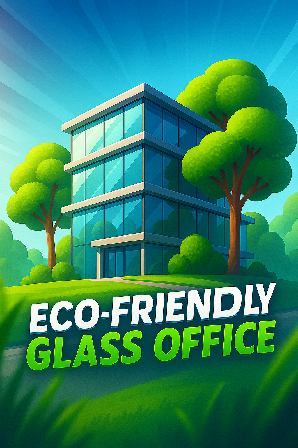 /Collection: /by davooda/Type: PNG/A vibrant illustration of a modern eco-friendly glass office surrounded by lush trees, showcasing sustainable architecture. The design features dynamic angles and a harmonious blend of colors.