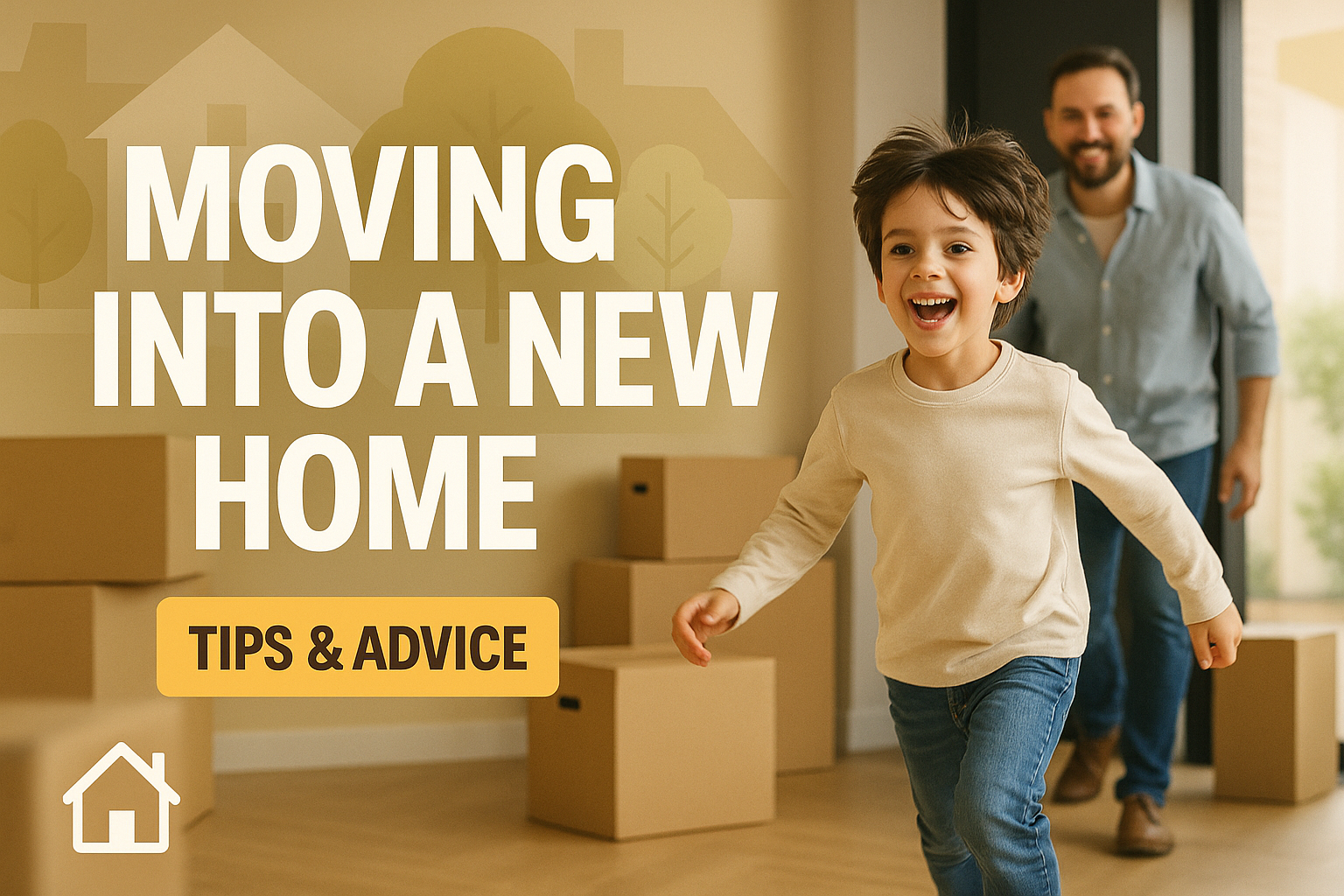 Engaging social media post highlighting moving advice, featuring a cheerful child running in a home setting. The design is warm and inviting, appealing to families.