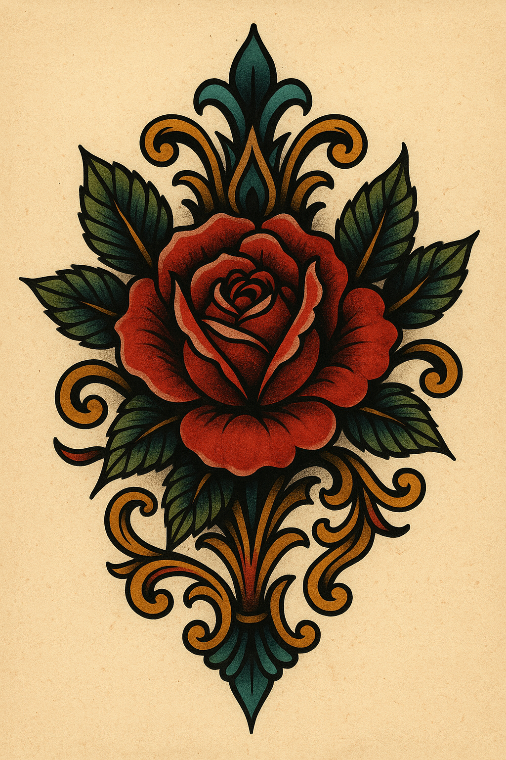 Vibrant Vintage Rose Tattoo Design with Decorative Elements