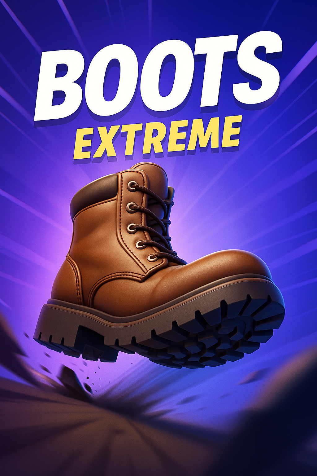 A striking 3D illustration of a brown boot, set against a vibrant gradient background. The boot appears to be in motion, emphasizing dynamism with lines radiating outward.