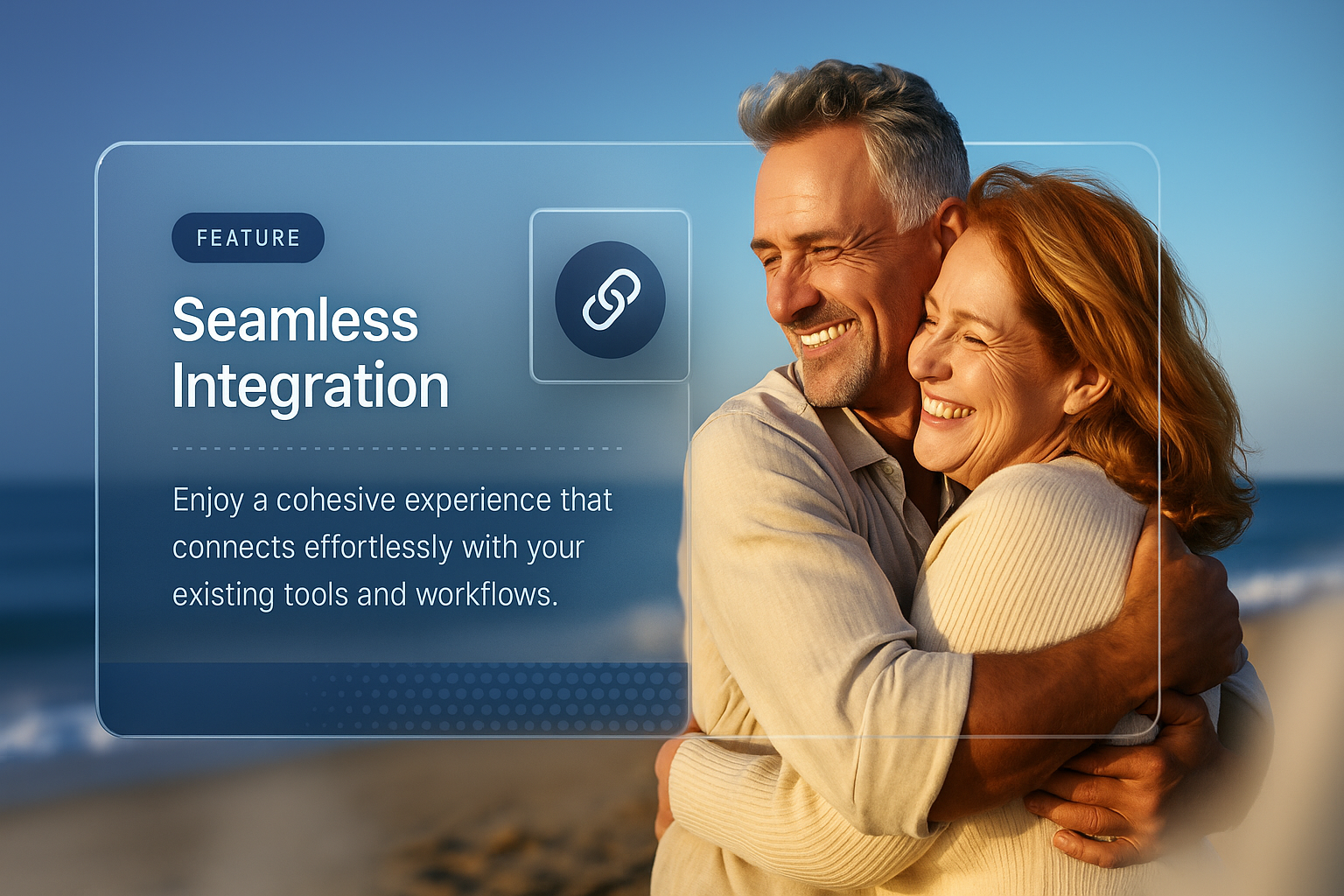 A middle-aged couple joyfully hugging on a beach, with a stylishly integrated design block showcasing features, enhancing the overall composition.