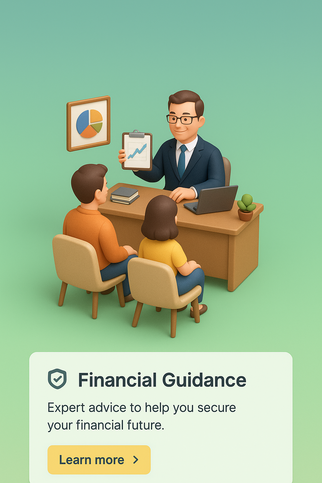 /Collection: /by davooda/Type: PNG/A 3D illustration of a confident financial advisor assisting clients in a cozy office setting. The scene is zoomed out to show a comprehensive view, emphasizing the advisor's supportive role.