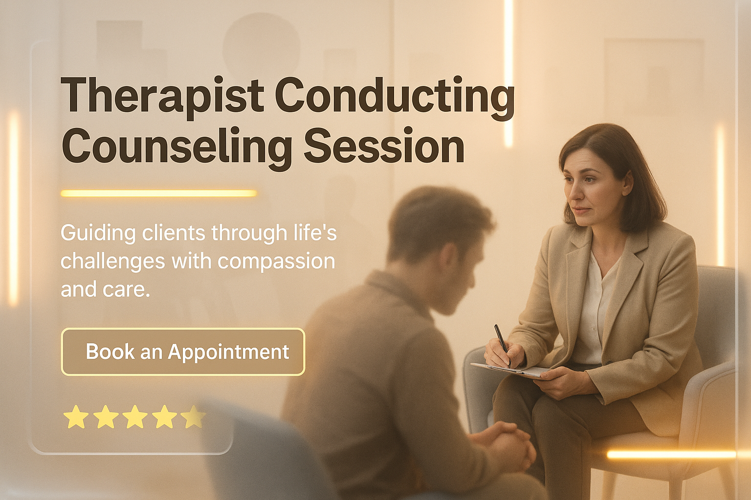 /Collection: /by davooda/Type: PNG/Professional graphic showcasing a therapist conducting a counseling session, aimed at promoting mental health services with a warm and inviting aesthetic.