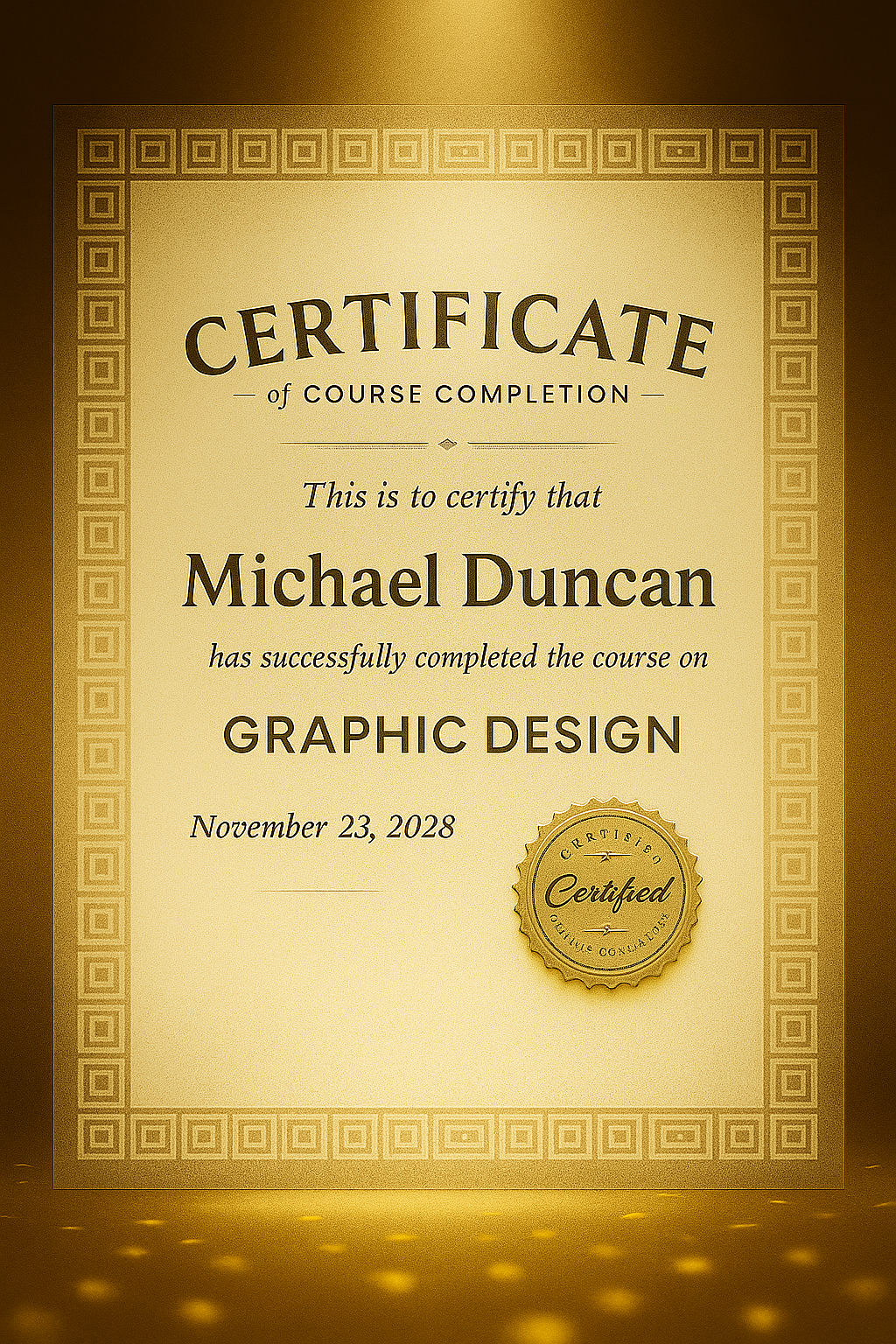 A formal course completion certificate featuring an ornate border and a gold seal, ideal for educational institutions and professional courses to acknowledge achievements.