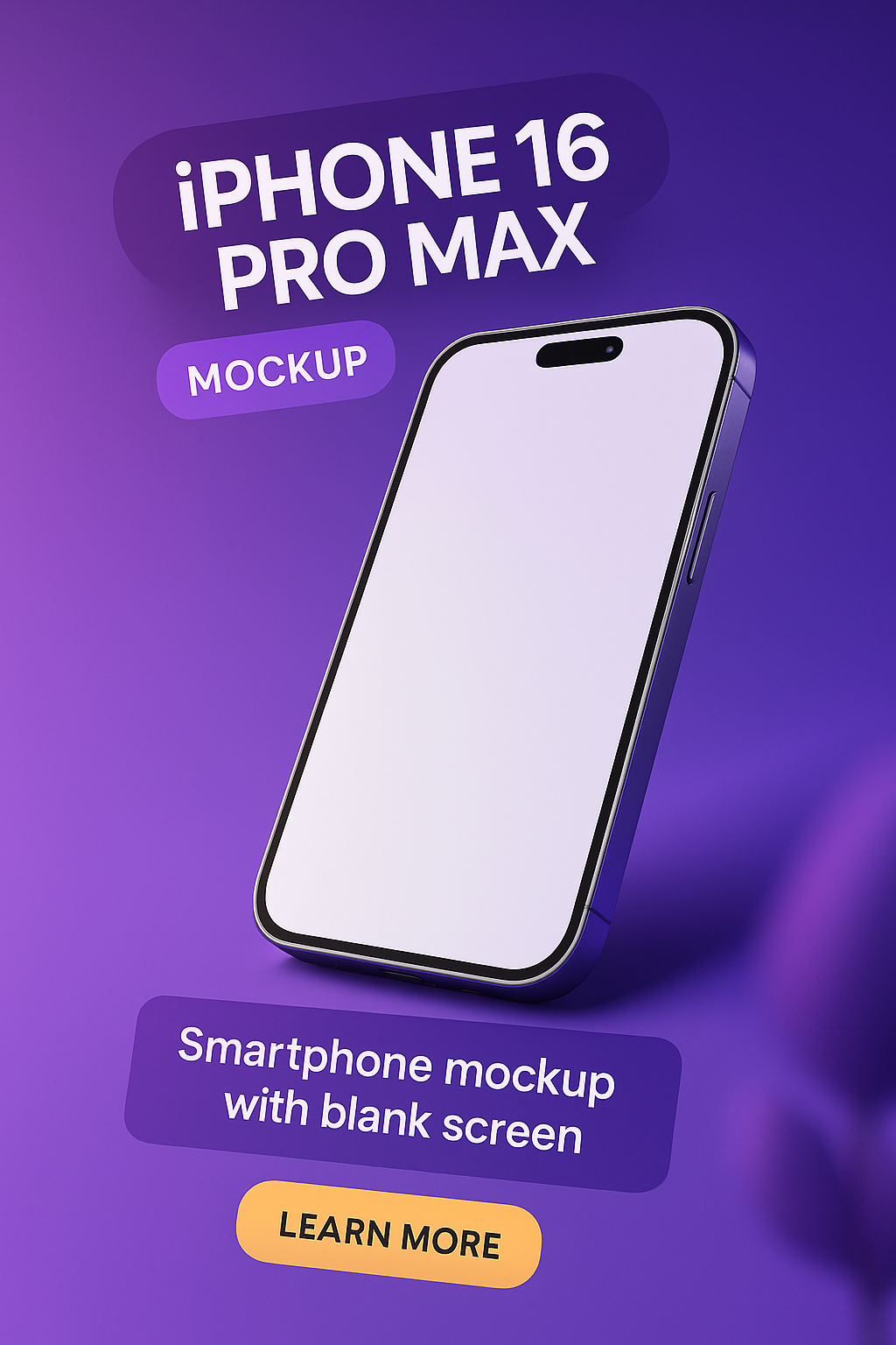 This image features a smartphone mockup of the iPhone 16 Pro Max with a blank screen. It has a modern design and vibrant color scheme, suitable for showcasing app designs or advertisements.