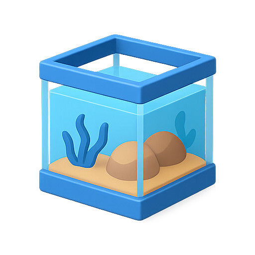 A colorful 3D illustration of a small aquarium featuring decorative rocks and aquatic plants, perfect for use in digital applications or environmental themes.