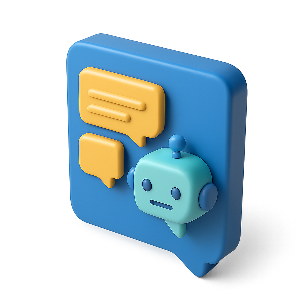 A vibrant 3D icon depicting a chatbot with a friendly face and speech bubbles. The design features a blue background with yellow and green elements, showcasing a modern and playful style.