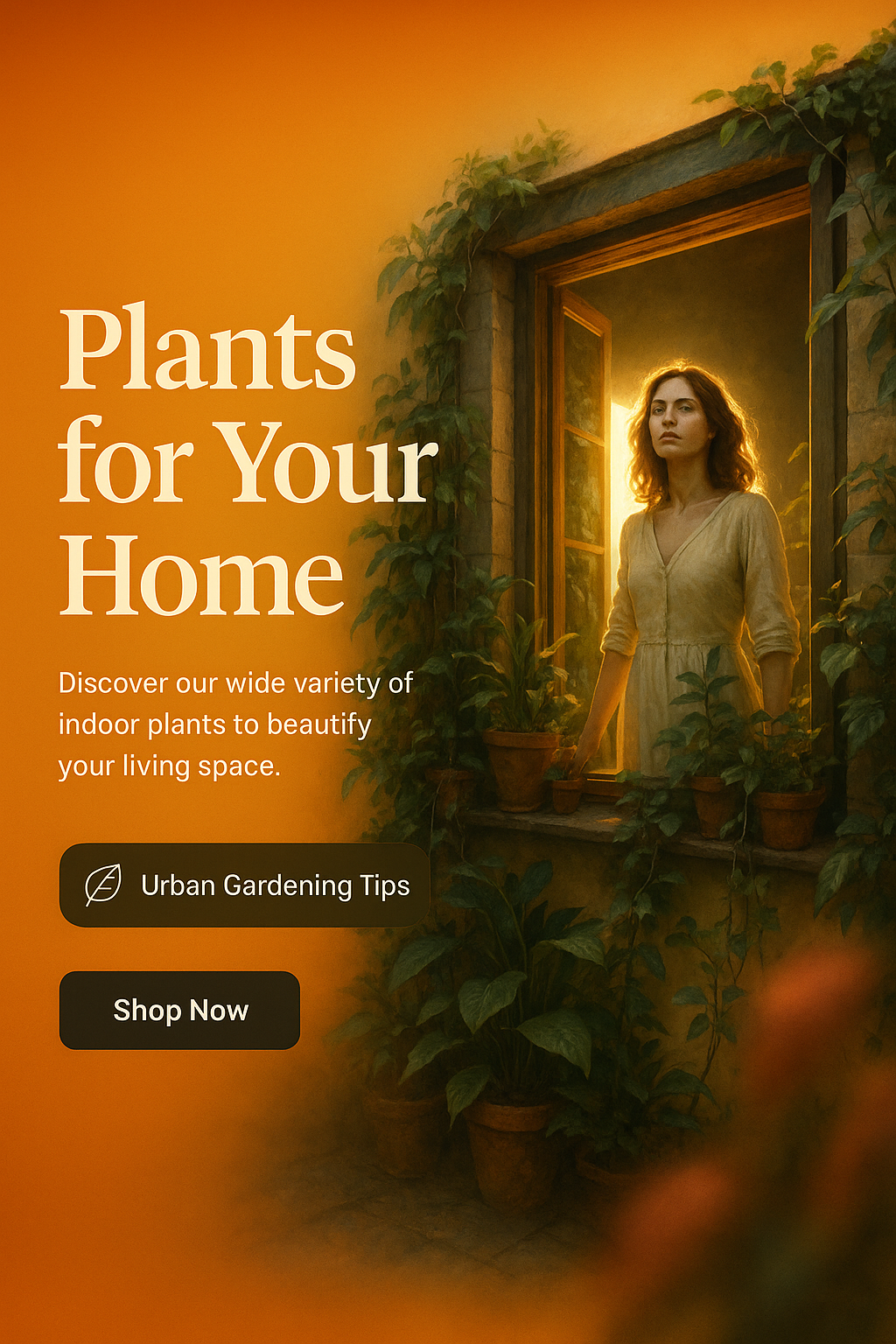 This image is a promotional graphic showcasing indoor plants, blending warm color tones and a serene atmosphere. It targets home decor enthusiasts.