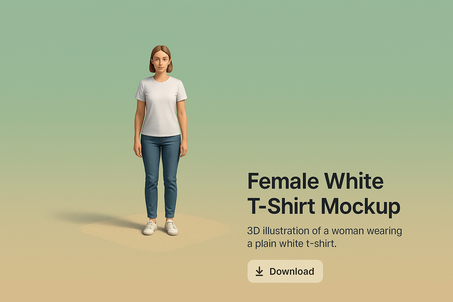 A realistic 3D illustration of a woman in a plain white t-shirt, set against a smooth gradient background. The scene includes a minimal text block and action button.