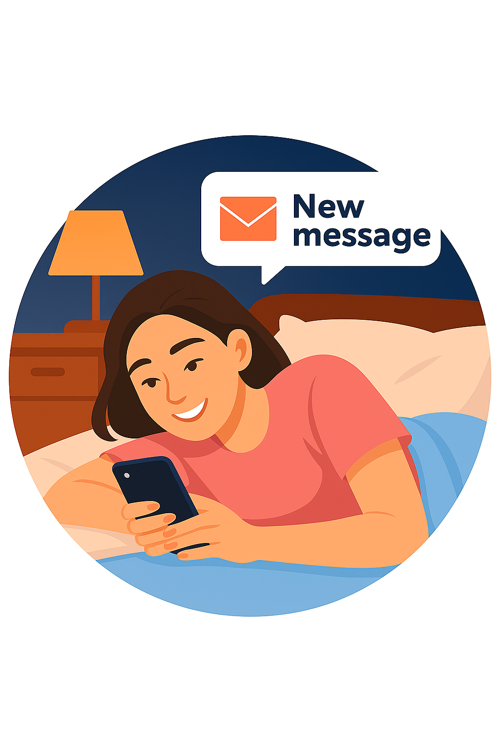 Vibrant illustration depicting a person in bed looking at their phone with a message notification, ideal for digital communication themes.