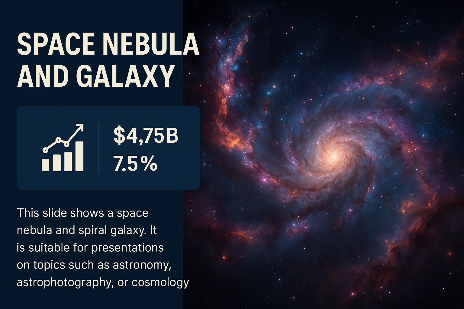 Visually captivating presentation slide featuring a space nebula and galaxy, ideal for educational content on astronomy, astrophotography, or cosmology.