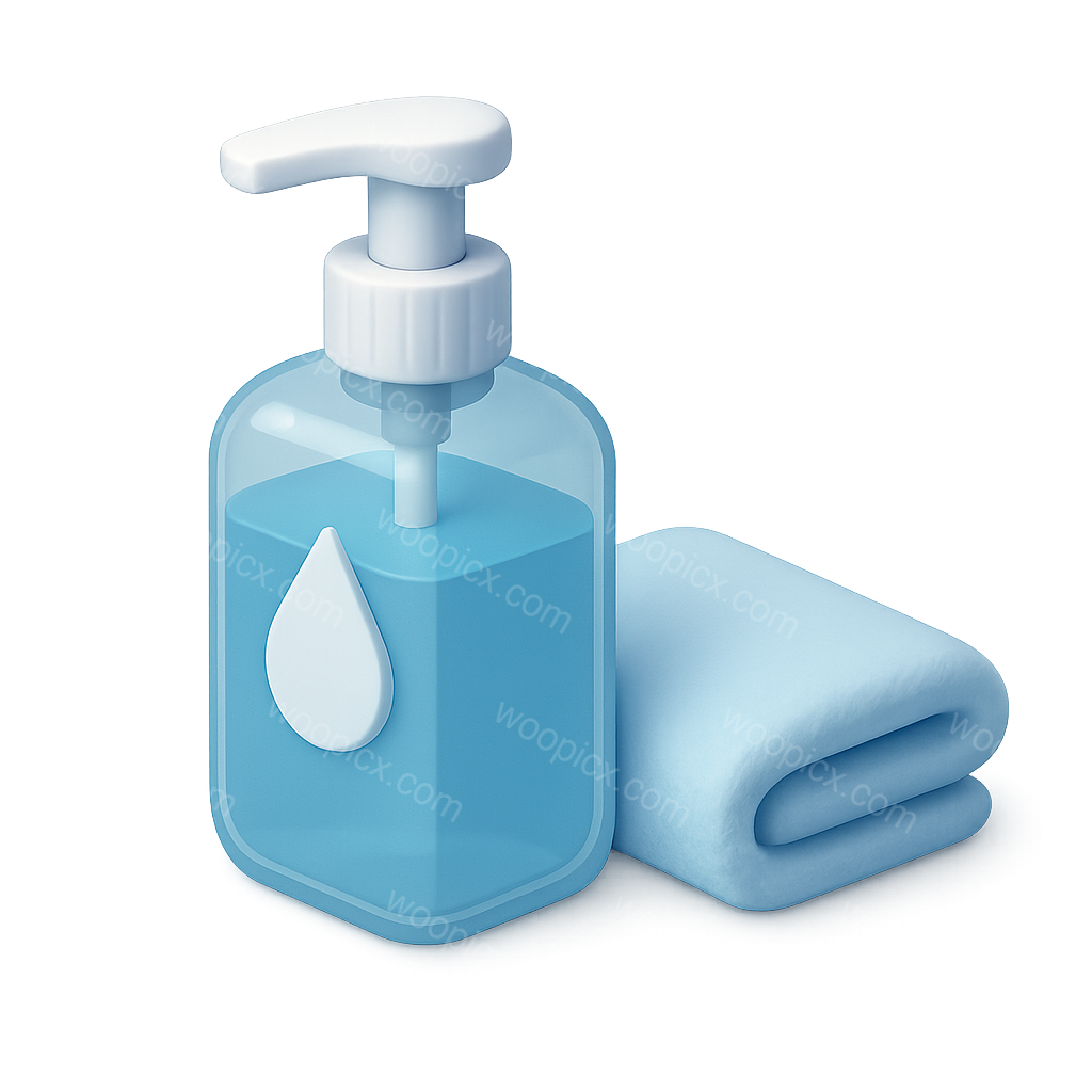 /Premium/Collection: /by davooda/Type: PNG/A 3D icon featuring a hand sanitizer bottle with a pump and a blue towel. The design is isometric, showcasing a translucent background and volumetric details for a modern look.