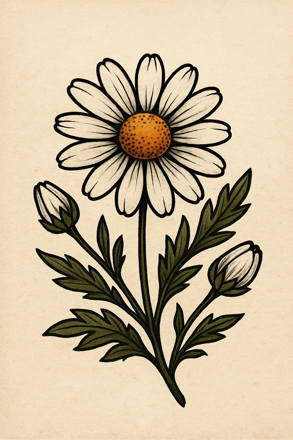 /Collection: /by davooda/Type: PNG/This image features a hand-drawn illustration of a daisy flower alongside its buds and green leaves, set against a textured background. Ideal for botanical art enthusiasts.