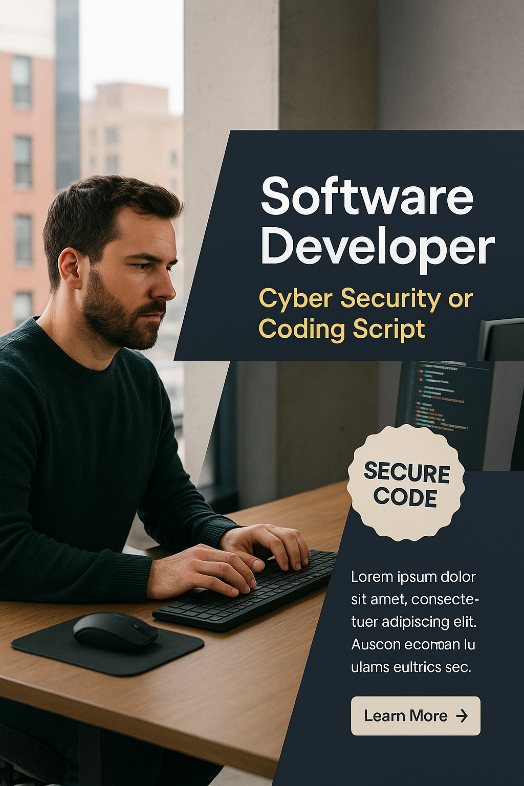 /Collection: /by davooda/Type: PNG/A focused software developer works at a computer, engaged in coding or cybersecurity tasks. The modern office setting features clear text elements and a professional aesthetic.