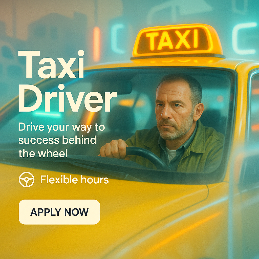 /Collection: /by davooda/Type: PNG/Engaging promotional image targeting potential taxi drivers, featuring a driver in a cab with a warm color palette and modern design elements, ideal for job recruitment campaigns.