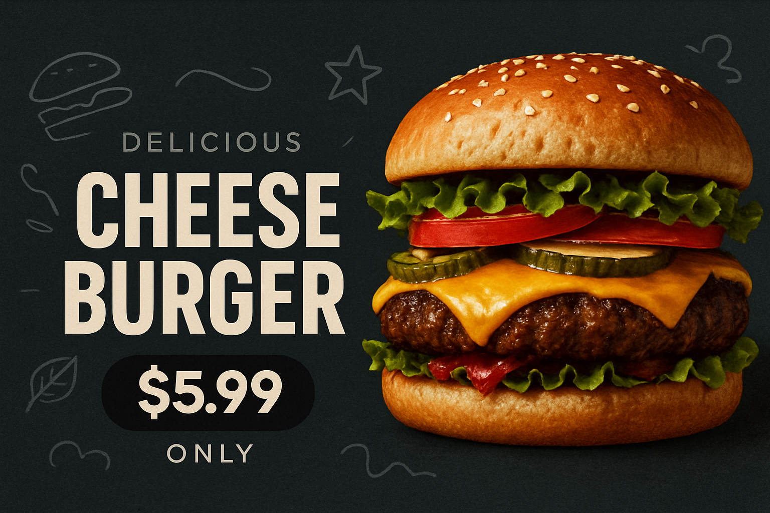 /Collection: /by davooda/Type: PNG/A vibrant advertisement showcasing a delicious cheeseburger against a textured dark background. Bold typography emphasizes the price and product, creating a dynamic and appetizing appeal.