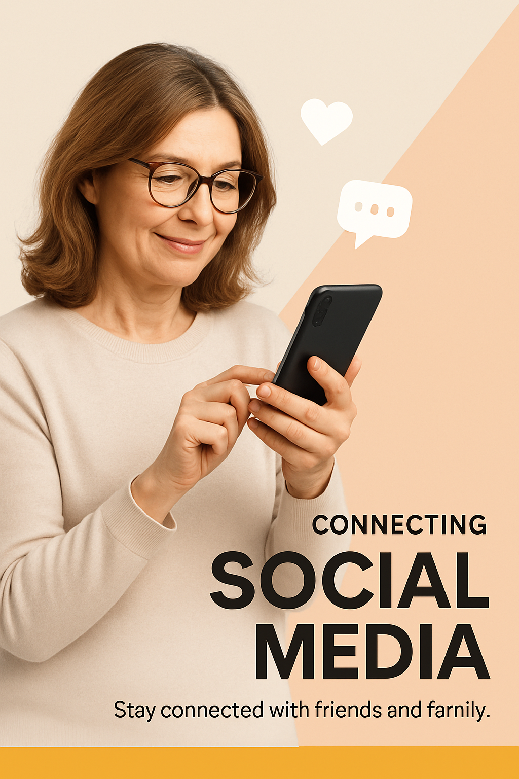 /Collection: /by davooda/Type: PNG/A middle-aged woman smiles while using her smartphone, immersed in social media. The background features contrasting light colors, enhancing the modern product style.