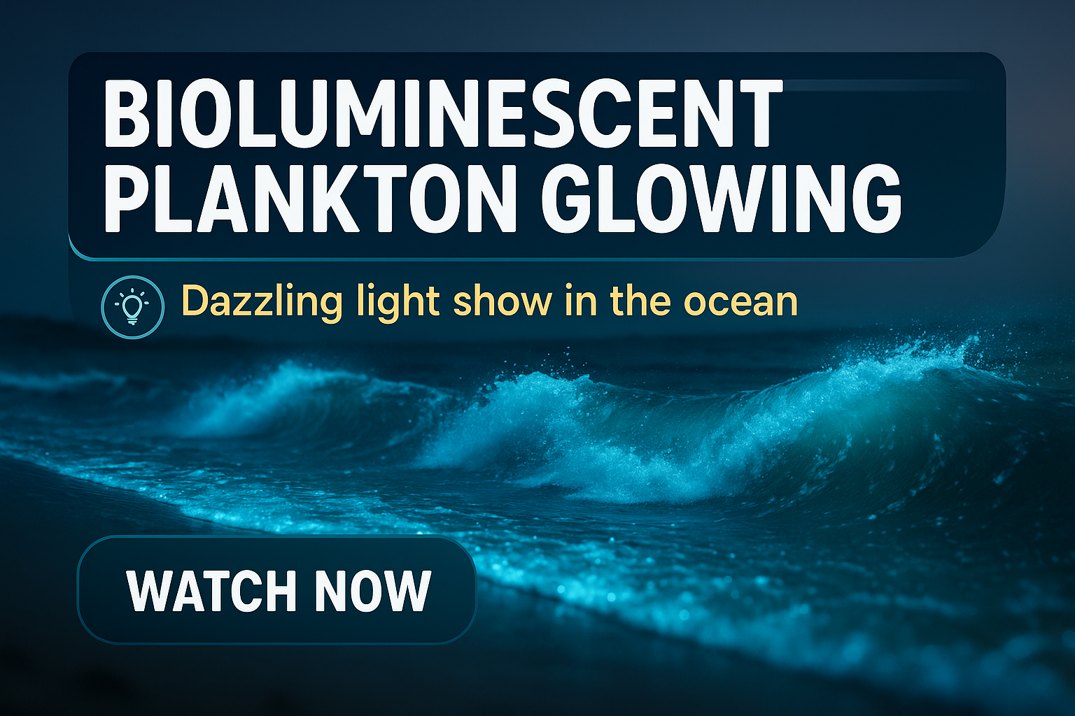 Engaging promotional image showcasing glowing bioluminescent plankton in ocean waves, designed to attract viewers for marine life exploration.