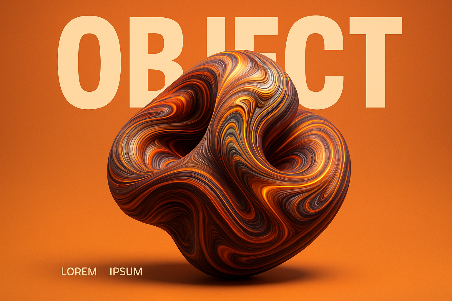 A captivating 3D abstract shape with swirling patterns, set against a warm gradient background. The bold word 'OBJECT' dominates the upper half, enhancing the modern design.