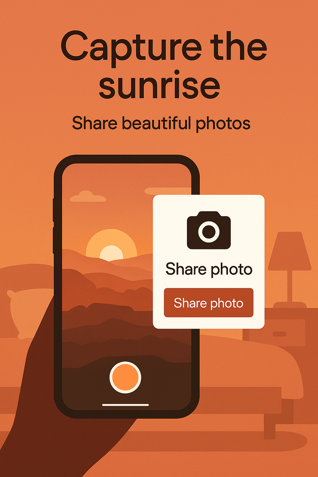 Engaging promotional graphic for a photography app, featuring a smartphone capturing a sunrise scene. Ideal for social media or app marketing.