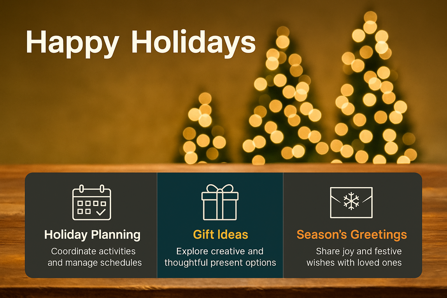 A visually engaging holiday-themed graphic featuring sections for planning, gift ideas, and greetings, perfect for seasonal marketing or social media sharing.