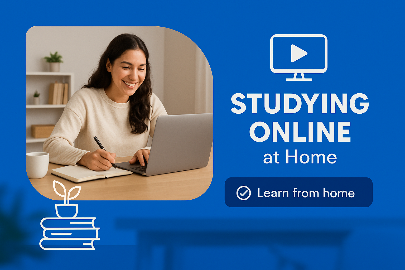 A promotional image highlighting online learning with a smiling student using a laptop at home, ideal for educational platforms or marketing materials.