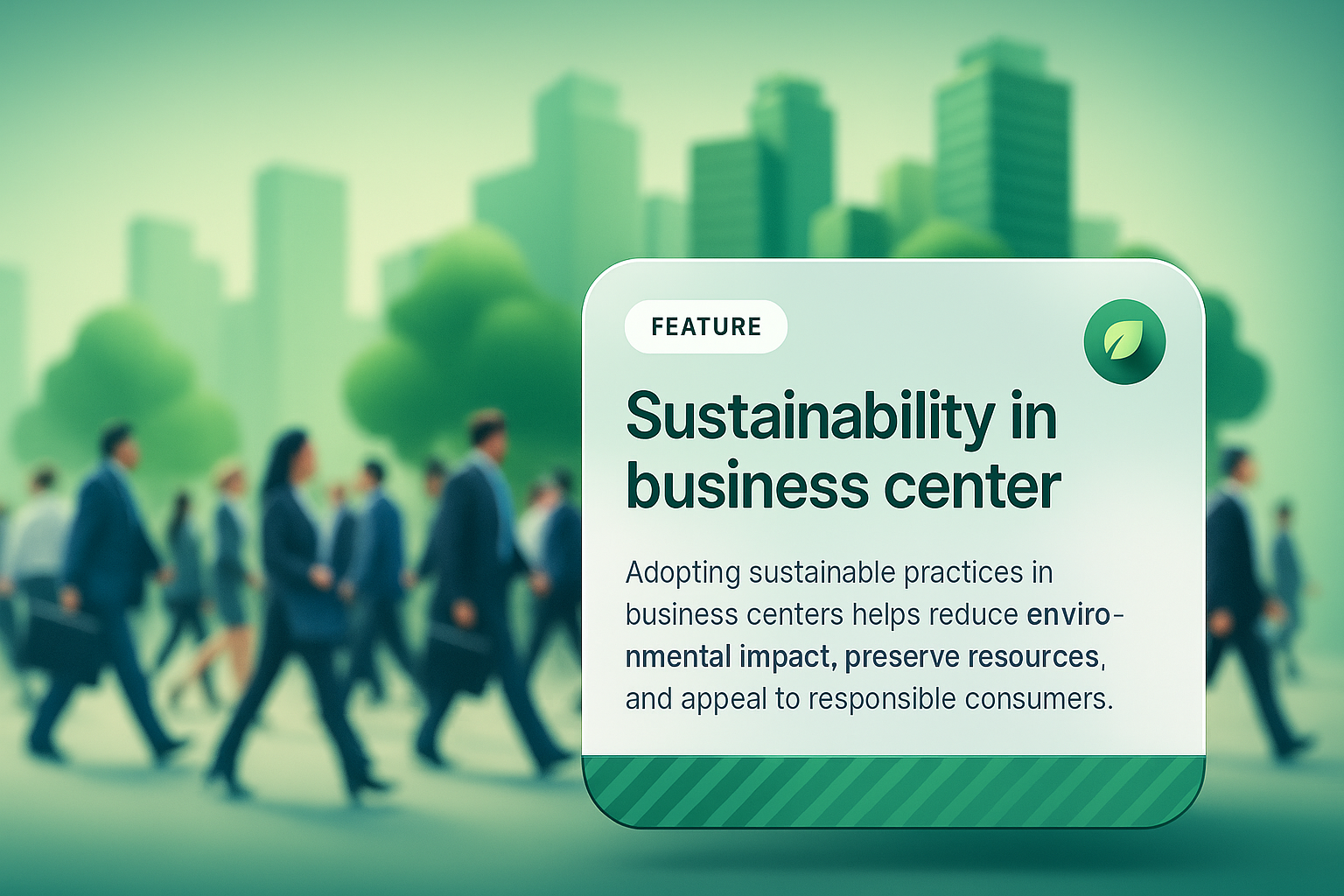 /Collection: /by davooda/Type: PNG/An abstract motion blur image featuring a crowd of business people walking in a green downtown environment. The design highlights sustainability in business centers with an integrated feature block.