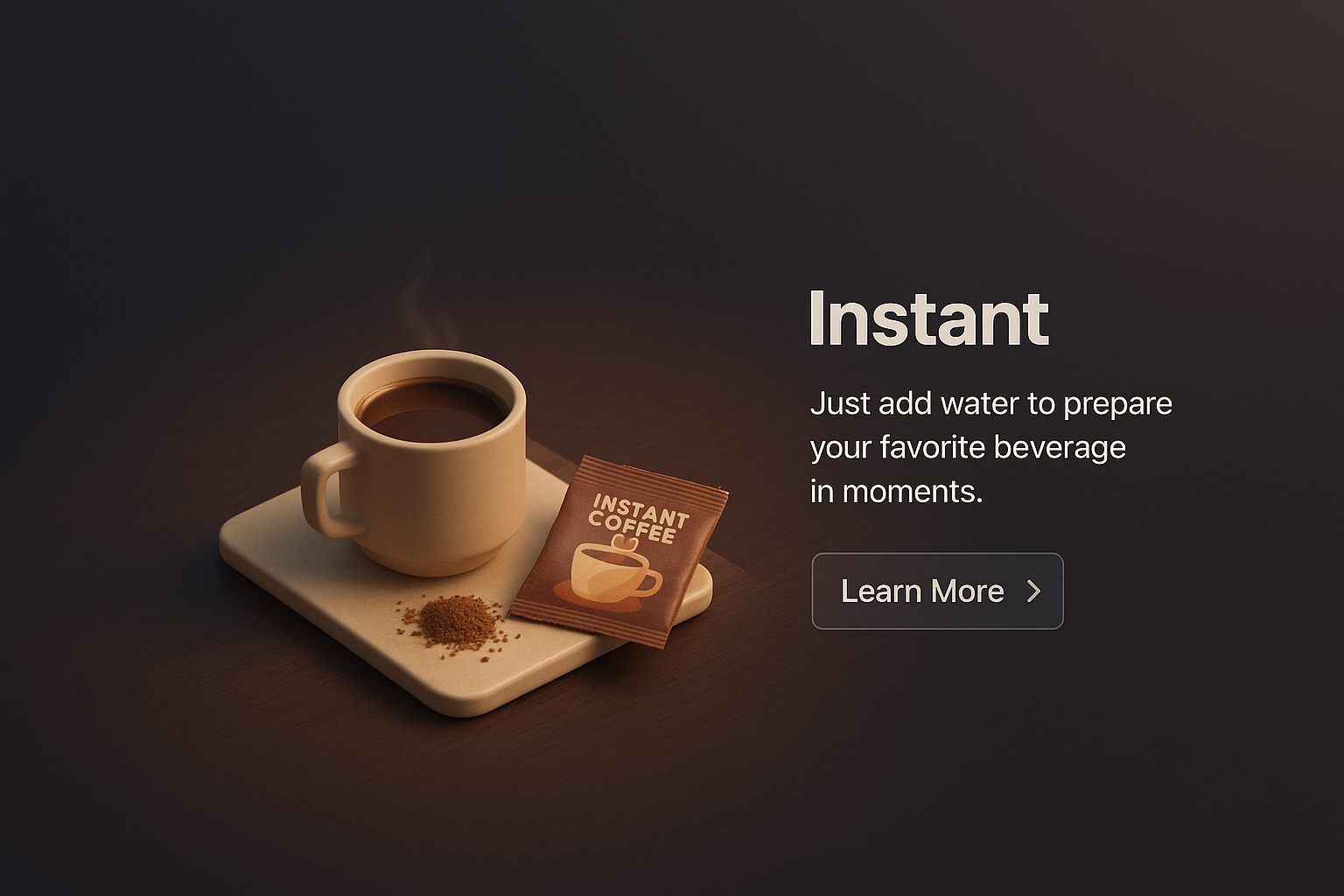 A detailed, zoomed-out 3D scene featuring a cup of instant coffee with a sachet on a simple tray. The background has a dark gradient, enhancing the warm tones of the coffee.