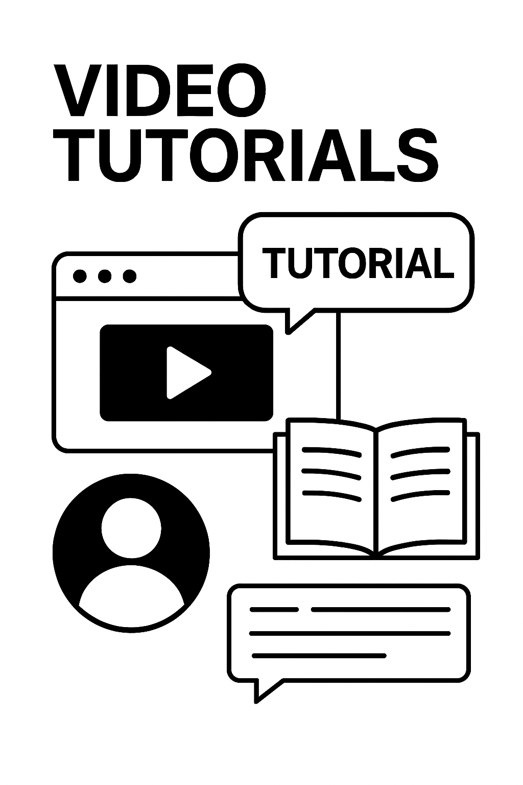 Minimalistic graphic showcasing the concept of video tutorials, featuring elements like a video player, book, and speech bubbles. Ideal for educational platforms or content creation.