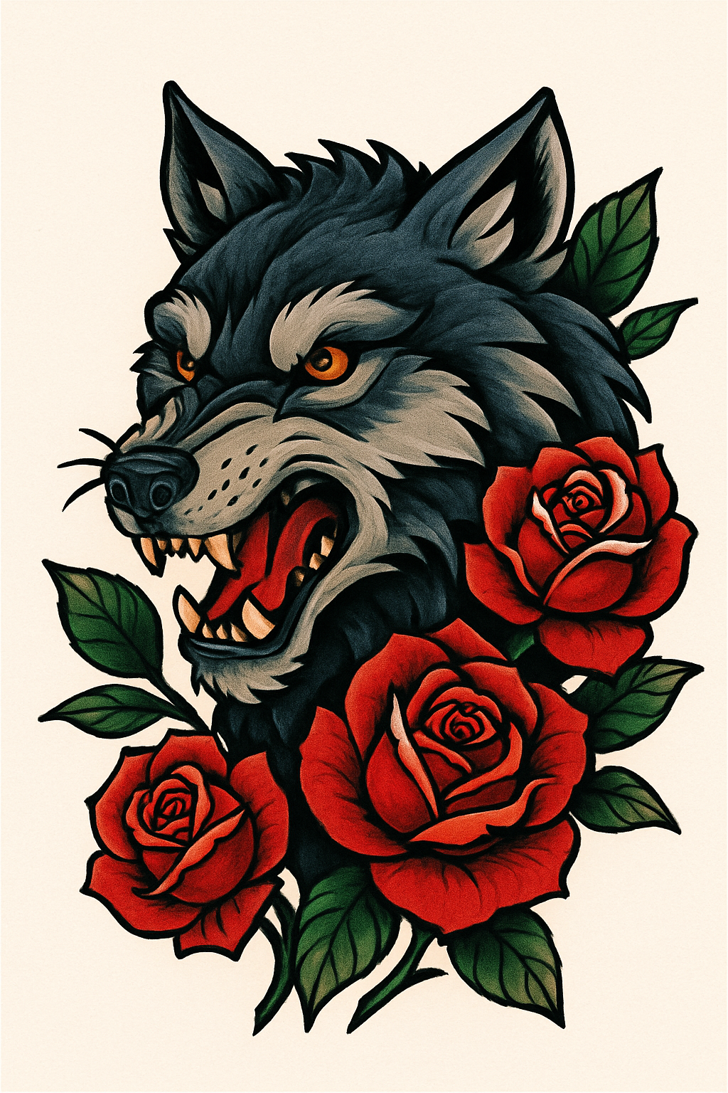 A striking tattoo illustration featuring a fierce wolf's head surrounded by bold red roses. The design showcases a blend of traditional and modern styles, making it ideal for tattoo enthusiasts and art lovers.