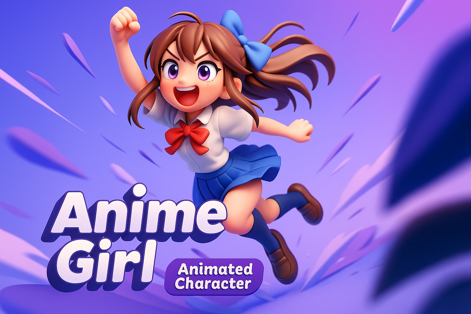 /Collection: /by davooda/Type: PNG/A vibrant 3D illustration featuring an anime girl energetically leaping through a dynamic scene, complemented by a smooth gradient background and engaging typography.