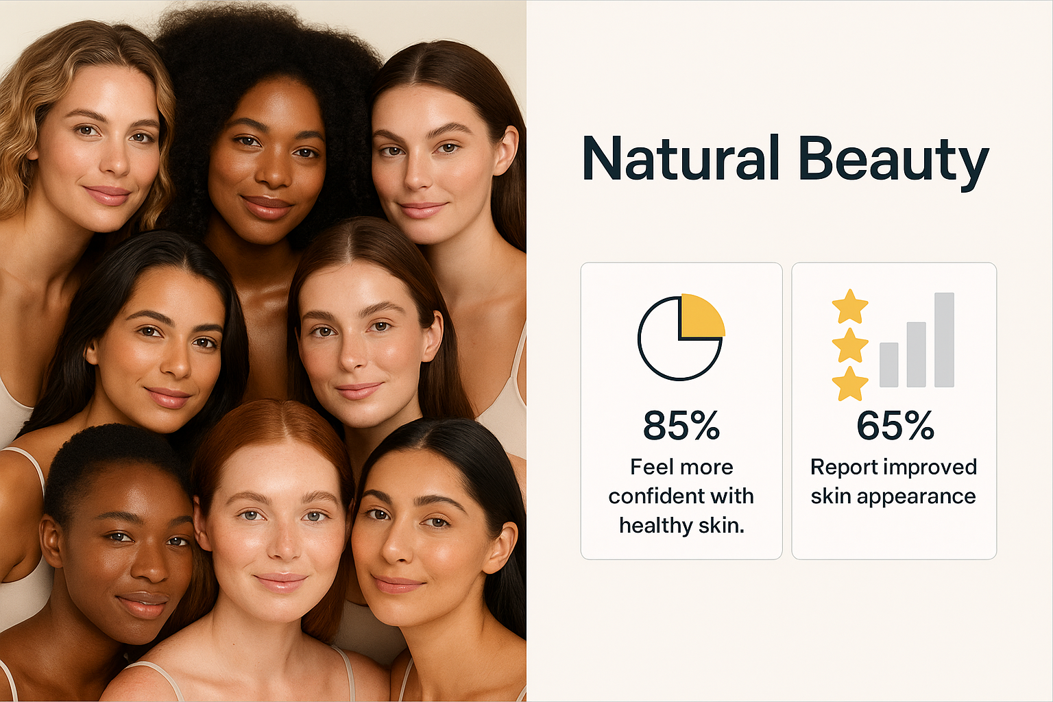 /Collection: /by davooda/Type: PNG/A visually appealing collage showcasing diverse women highlighting natural beauty and skin confidence metrics, perfect for beauty brands and wellness campaigns.