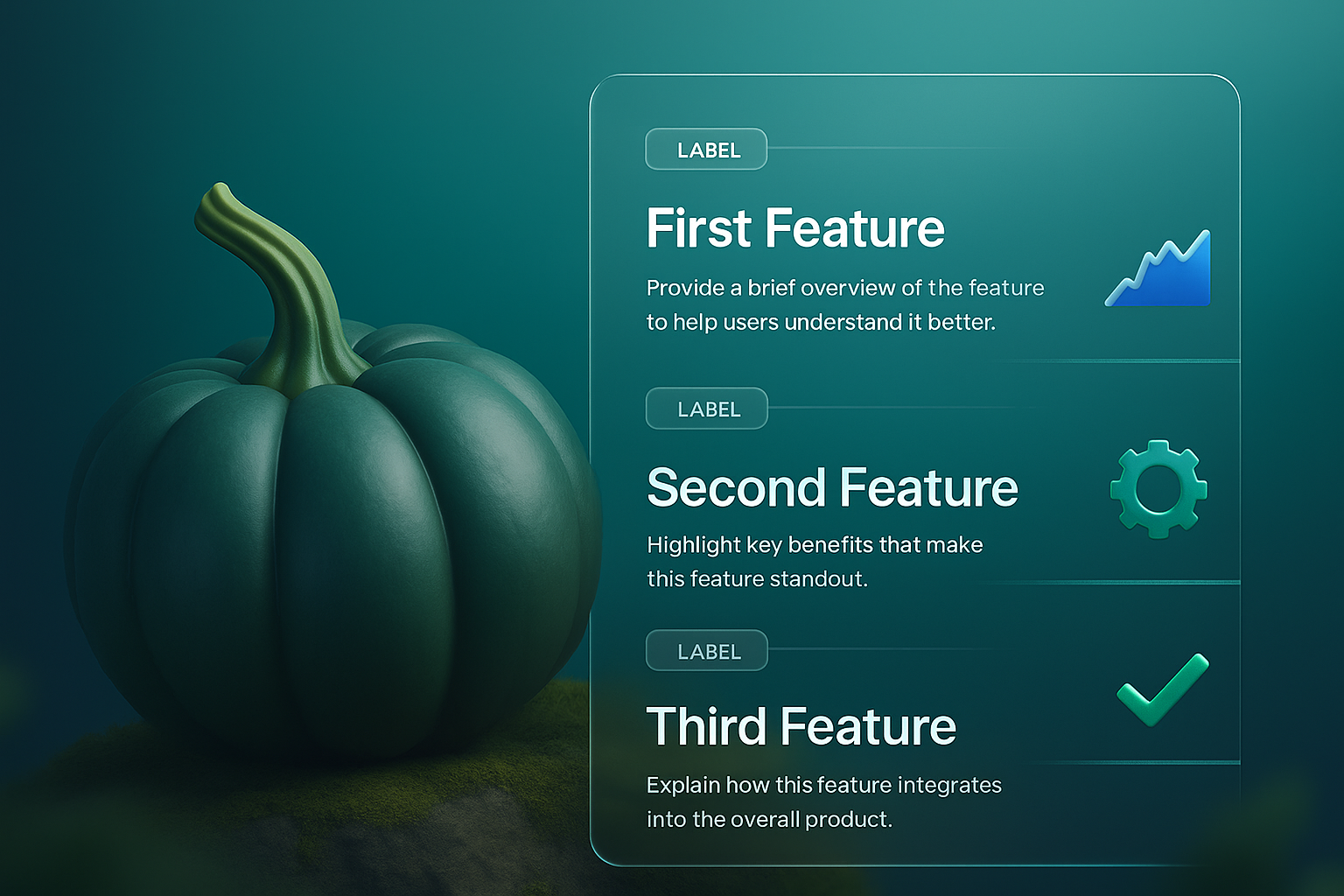 A vibrant 3D illustration of a pumpkin on a smooth gradient background, featuring three labeled blocks highlighting key features with a modern design.