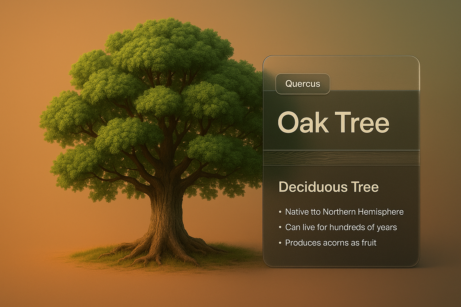 /Collection: /by davooda/Type: PNG/A detailed 3D illustration of an oak tree set against a smooth gradient background. The design features an integrated information block with a dark translucent overlay, showcasing key facts about the tree.